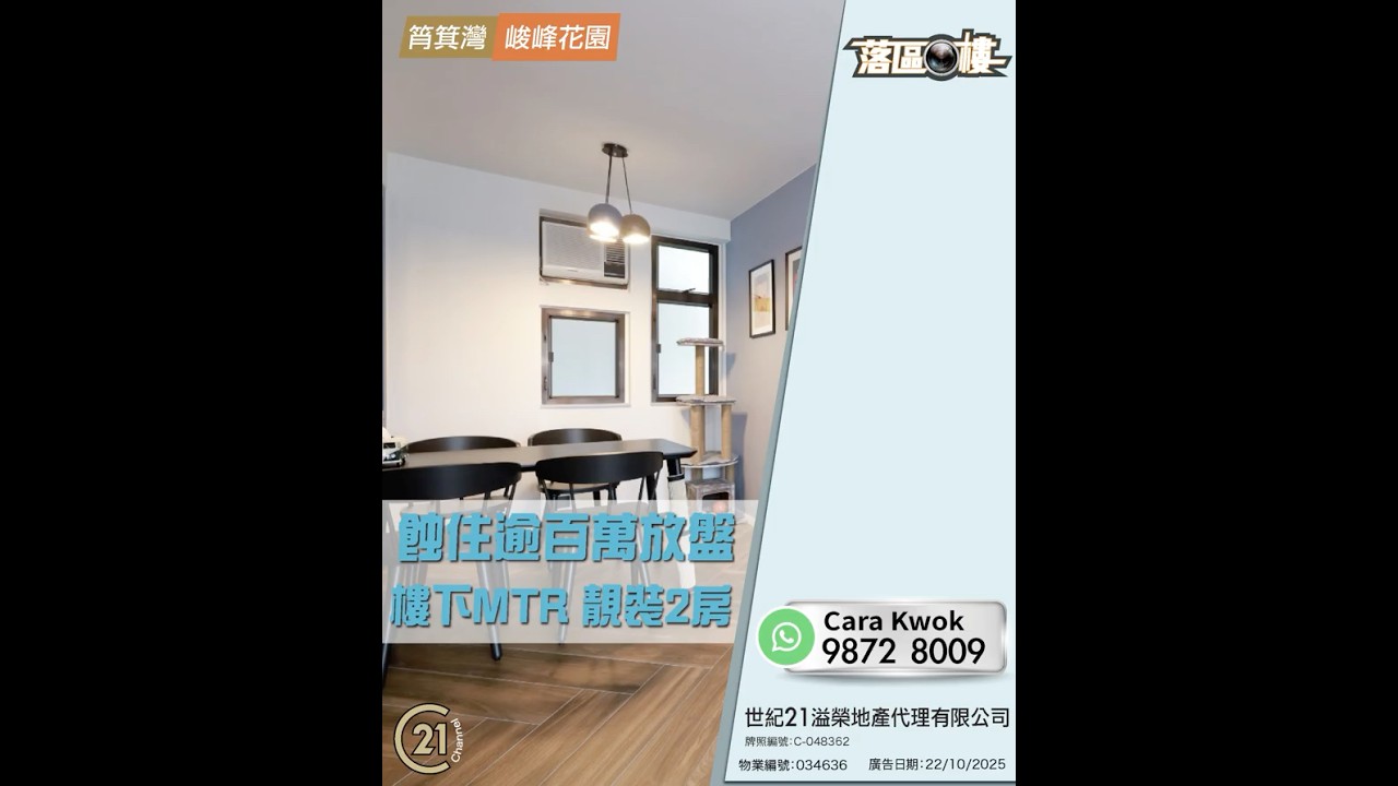 落區睇樓 🏠 蝕近百萬放盤,靚裝2房2廳,可以即住!樓下就是地鐵站出入口,1分鐘即達,而附近有多元化民生商店,配套應有盡有! 👉🏻 https://url.c21.hk/034636 筲箕灣 峻峰花園 實用面積:450呎 電話號碼:📞9872 8009 ( Cara Kwok ) 世紀21溢榮地產代理有限公司 牌照編號:C-048362 物業編號:034636 廣告日期:22/10/2025 📲whatsapp查詢:https://url.c21.hk/wts #筲箕灣 #峻峰花園 #靚裝 #蝕讓 #二手樓盤 #落區睇樓 #一手 #二手 #上車 #租務 #世紀21香港 #世紀21 #C21 #Century21 #21channel #21頻道 ---------------------------------------------------- 📍設定「搶先看」樓盤資訊即時收看📍 🔎世紀21香港官網 👉 https://c21.hk/ 🖥世紀21香港Facebook👉 https://url.c21.hk/fb 📞聯絡查詢:28697221 🔻讚好🔻訂閱🔻分享🔻LIKE🔻FOLLOW🔻SHARE ---------------------------------------------------- *以上的樓盤資料,由特許經營商提供及擁有,而每辦事處乃獨立擁有及經營(Each CENTURY 21 Office Is Independently Owned and Operated)。由於資料並非實時同步擷取,不確保樓盤廣告能反映樓盤的最新狀態,只僅作參考用途。若有錯漏而引致任何不便及損失,請直接向有關特許經營商或分行查詢,世紀21香港概不負責。