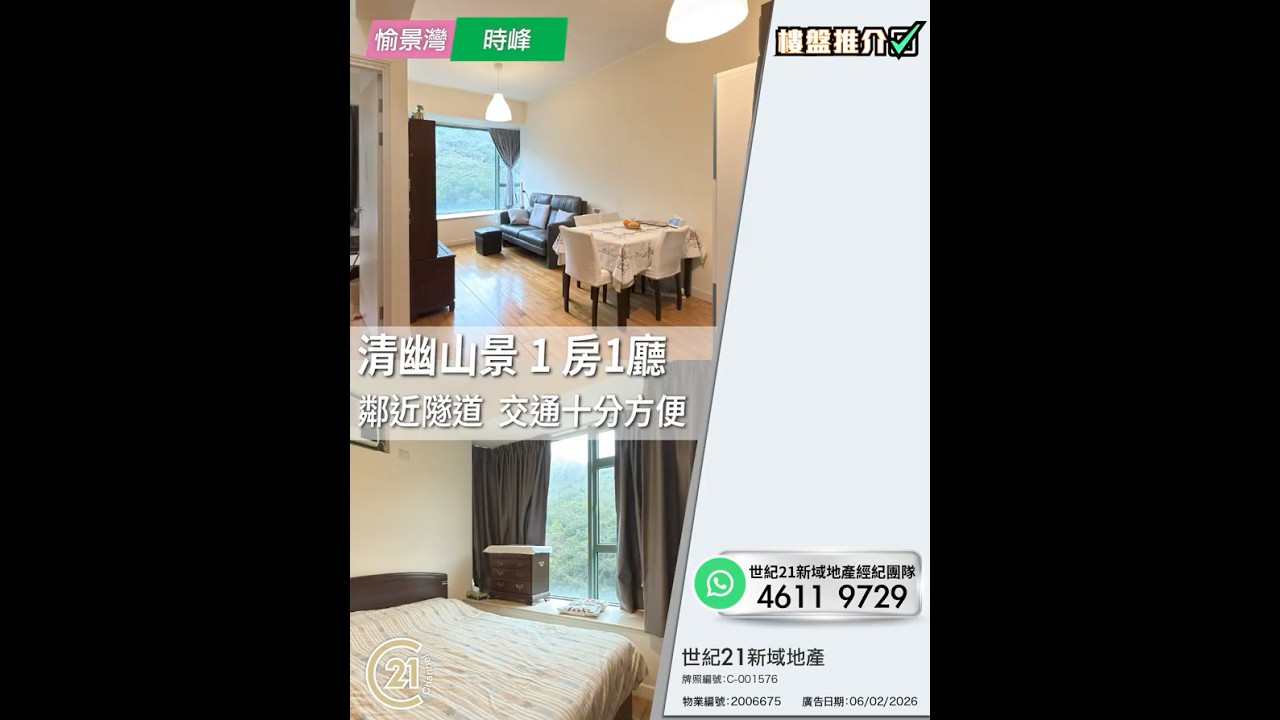 樓盤推介:清幽山景 1 房1廳 鄰近隧道 交通十分方便 | 愉景灣 時峰 👉🏻 https://url.c21.hk/2006675 愉景灣 時峰 實用面積: 440 呎 電話號碼: 2987 9729 / WhatsApp: 4611 9729 (世紀21新域地產經紀團隊) 世紀21新域地產 牌照編號: :C-001576 物業編號: 2006675 廣告日期: 06/02/2026 📲whatsapp查詢:https://url.c21.hk/wts #愉景灣 #時峰 #1房 #山景 #二手樓盤 #落區睇樓 #一手 #二手 #上車 #租務 #世紀21香港 #世紀21 #C21 #Century21 #21channel #21頻道 ---------------------------------------------------- 📍設定「搶先看」樓盤資訊即時收看📍 🔎世紀21香港官網 👉 https://c21.hk/ 🖥世紀21香港Facebook👉 https://url.c21.hk/fb 📞聯絡查詢:28697221 🔻讚好🔻訂閱🔻分享🔻LIKE🔻FOLLOW🔻SHARE ---------------------------------------------------- *以上的樓盤資料,由特許經營商提供及擁有,而每辦事處乃獨立擁有及經營(Each CENTURY 21 Office Is Independently Owned and Operated)。由於資料並非實時同步擷取,不確保樓盤廣告能反映樓盤的最新狀態,只僅作參考用途。若有錯漏而引致任何不便及損失,請直接向有關特許經營商或分行查詢,世紀21香港概不負責。