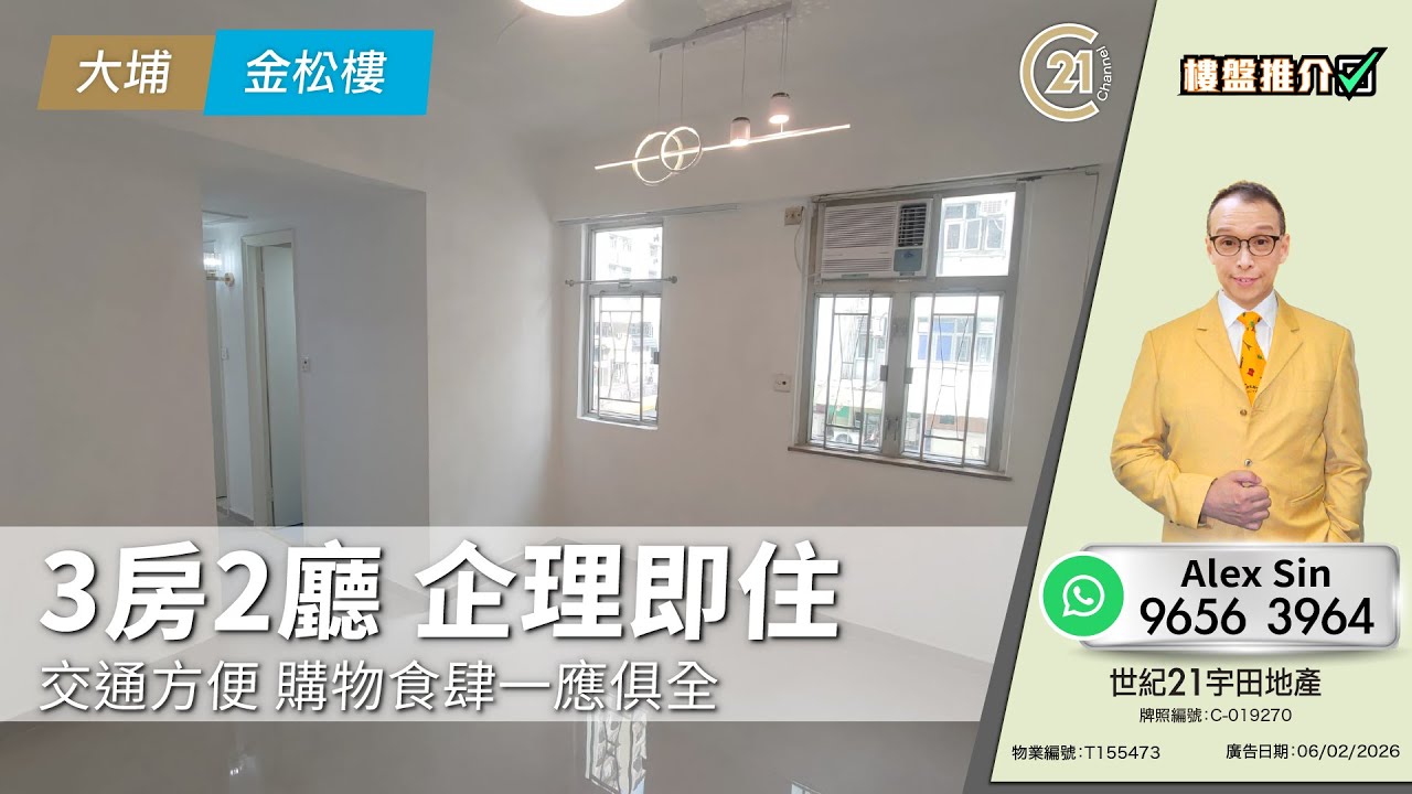 樓盤推介: 3房2廳 企理即住 交通方便 購物食肆一應俱全 | 大埔 金松樓 👉🏻 https://url.c21.hk/T155473 大埔 金松樓 (售/租) 實用面積: 425 呎 電話號碼: 9656 3964 (Alex Sin) 世紀21宇田地產 牌照編號: :C-019270 物業編號: T155473 廣告日期: 06/02/2026 📲whatsapp查詢:https://url.c21.hk/wts #大埔 #金松樓 #3房 #二手樓盤 #落區睇樓 #一手 #二手 #上車 #租務 #世紀21香港 #世紀21 #C21 #Century21 #21channel #21頻道 ---------------------------------------------------- 📍設定「搶先看」樓盤資訊即時收看📍 🔎世紀21香港官網 👉 https://c21.hk/ 🖥世紀21香港Facebook👉 https://url.c21.hk/fb 📞聯絡查詢:28697221 🔻讚好🔻訂閱🔻分享🔻LIKE🔻FOLLOW🔻SHARE ---------------------------------------------------- *以上的樓盤資料,由特許經營商提供及擁有,而每辦事處乃獨立擁有及經營(Each CENTURY 21 Office Is Independently Owned and Operated)。由於資料並非實時同步擷取,不確保樓盤廣告能反映樓盤的最新狀態,只僅作參考用途。若有錯漏而引致任何不便及損失,請直接向有關特許經營商或分行查詢,世紀21香港概不負責。
