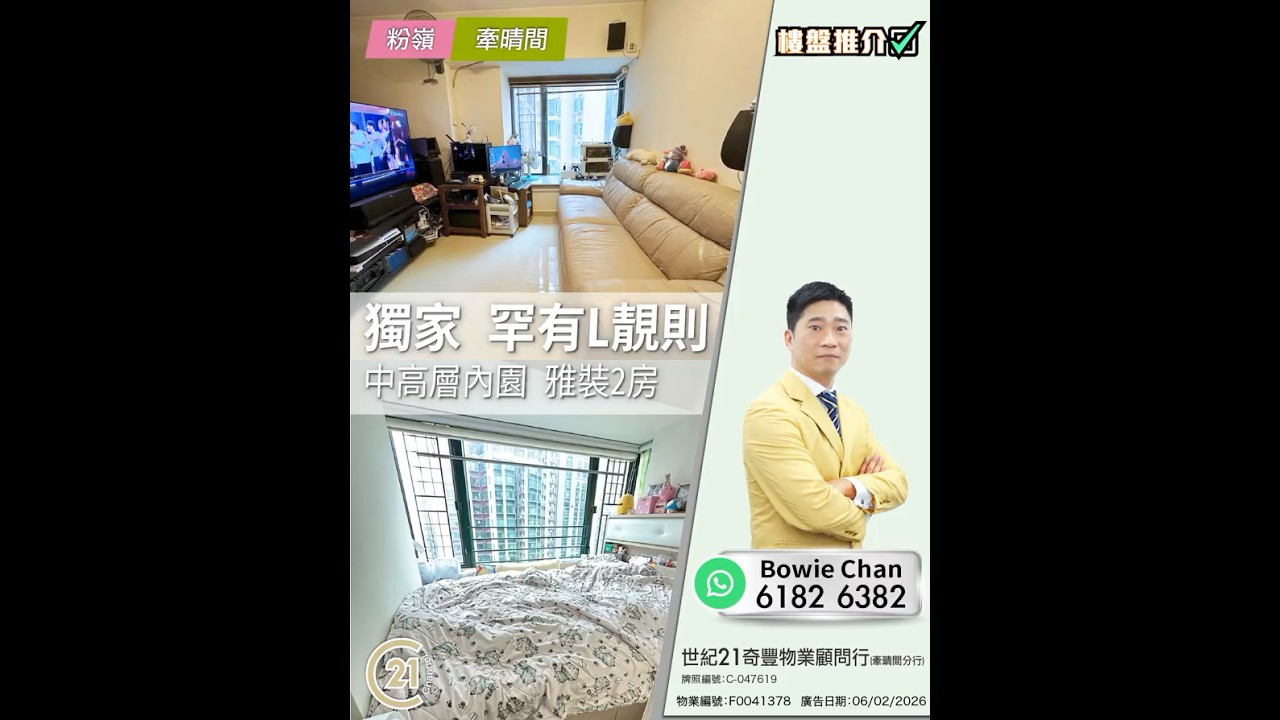 樓盤推介: 獨家 罕有L靚則 中高層內園 雅裝2房 | 粉嶺 牽晴間 👉🏻 https://url.c21.hk/F0041378 粉嶺 牽晴間 實用面積: 392 呎 電話號碼: 6182 6382 (Bowie Chan) 世紀21奇豐物業顧問行 (牽晴間分行) 牌照編號: :C-001576 物業編號: F0041378 廣告日期: 06/02/2026 📲whatsapp查詢:https://url.c21.hk/wts #粉嶺 #牽晴間 #2房 #內園景 #二手樓盤 #落區睇樓 #一手 #二手 #上車 #租務 #世紀21香港 #世紀21 #C21 #Century21 #21channel #21頻道 ---------------------------------------------------- 📍設定「搶先看」樓盤資訊即時收看📍 🔎世紀21香港官網 👉 https://c21.hk/ 🖥世紀21香港Facebook👉 https://url.c21.hk/fb 📞聯絡查詢:28697221 🔻讚好🔻訂閱🔻分享🔻LIKE🔻FOLLOW🔻SHARE ---------------------------------------------------- *以上的樓盤資料,由特許經營商提供及擁有,而每辦事處乃獨立擁有及經營(Each CENTURY 21 Office Is Independently Owned and Operated)。由於資料並非實時同步擷取,不確保樓盤廣告能反映樓盤的最新狀態,只僅作參考用途。若有錯漏而引致任何不便及損失,請直接向有關特許經營商或分行查詢,世紀21香港概不負責。