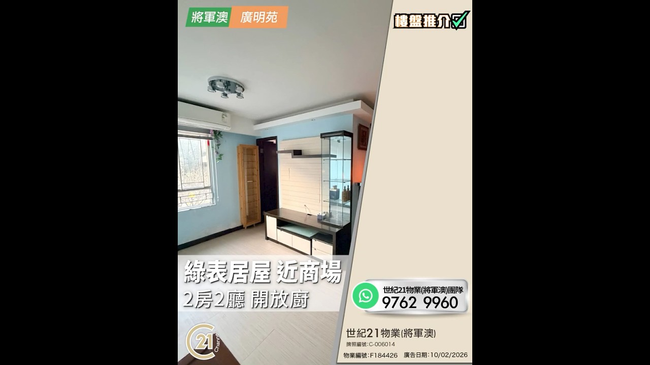 樓盤推介: 綠表居屋 近商場 2房2廳 開放廚 | 將軍澳 廣明苑 👉🏻 https://url.c21.hk/F184426 廣明苑 廣瑞閣 (綠表) 實用面積: 601 呎 電話號碼: 9337 7100 (Vincent Wong) 世紀21物業(將軍澳) 牌照編號: C-006014 物業編號: F184426 廣告日期: 10/02/2026 📲whatsapp查詢:https://url.c21.hk/wts #將軍澳 #廣明苑 #2房 #開放廚 #綠表 #交通方便 #二手樓盤 #落區睇樓 #一手 #二手 #上車 #租務 #世紀21香港 #世紀21 #C21 #Century21 #21channel #21頻道 ---------------------------------------------------- 📍設定「搶先看」樓盤資訊即時收看📍 🔎世紀21香港官網 👉 https://c21.hk/ 🖥世紀21香港Facebook👉 https://url.c21.hk/fb 📞聯絡查詢:28697221 🔻讚好🔻訂閱🔻分享🔻LIKE🔻FOLLOW🔻SHARE ---------------------------------------------------- *以上的樓盤資料,由特許經營商提供及擁有,而每辦事處乃獨立擁有及經營(Each CENTURY 21 Office Is Independently Owned and Operated)。由於資料並非實時同步擷取,不確保樓盤廣告能反映樓盤的最新狀態,只僅作參考用途。若有錯漏而引致任何不便及損失,請直接向有關特許經營商或分行查詢,世紀21香港概不負責。