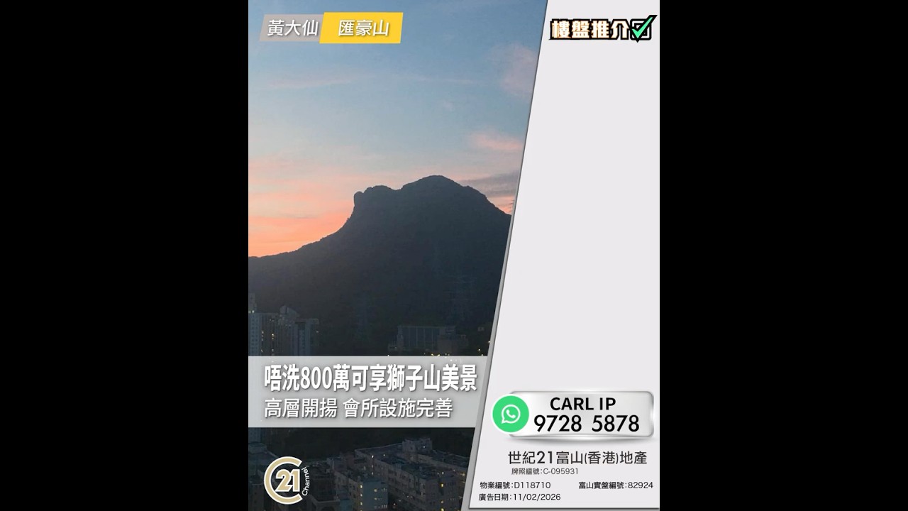 樓盤推介: 唔洗800萬可享獅子山美景高層開揚 會所設施完善 | 黃大仙 匯豪山 👉🏻 https://url.c21.hk/D118710 黃大仙 匯豪山 實用面積: 538 呎 電話號碼: 97285878 (Carl Ip) 世紀21富山 (香港) 牌照編號: C-001576 物業編號: D118710 廣告日期: 11/02/2026 📲whatsapp查詢:https://url.c21.hk/wts #黃大仙 #匯豪山 #開揚景 #獅子山 #交通方便 #二手樓盤 #落區睇樓 #一手 #二手 #上車 #租務 #世紀21香港 #世紀21 #C21 #Century21 #21channel #21頻道 ---------------------------------------------------- 📍設定「搶先看」樓盤資訊即時收看📍 🔎世紀21香港官網 👉 https://c21.hk/ 🖥世紀21香港Facebook👉 https://url.c21.hk/fb 📞聯絡查詢:28697221 🔻讚好🔻訂閱🔻分享🔻LIKE🔻FOLLOW🔻SHARE ---------------------------------------------------- *以上的樓盤資料,由特許經營商提供及擁有,而每辦事處乃獨立擁有及經營(Each CENTURY 21 Office Is Independently Owned and Operated)。由於資料並非實時同步擷取,不確保樓盤廣告能反映樓盤的最新狀態,只僅作參考用途。若有錯漏而引致任何不便及損失,請直接向有關特許經營商或分行查詢,世紀21香港概不負責。