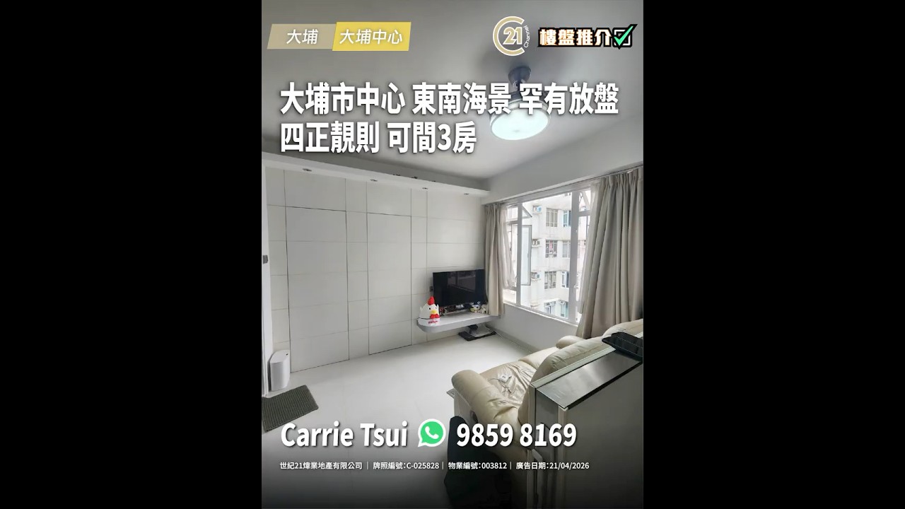 大埔 大埔中心 (售) 實用面積: 453 呎 電話號碼: Carrie Tsui 9859 8169 更多物業資訊:https://url.c21.hk/003812 世紀21煒業地產 牌照編號:C-025828 物業編號:003812 廣告日期:21/04/2026 📲whatsapp查詢:https://url.c21.hk/wts #大埔 #大埔中心 #2房 #開揚 #少海景 #四正 #交通方便 #二手樓盤 #落區睇樓 #一手 #二手 #上車 #租務 #世紀21香港 #世紀21 #C21 #Century21 #21channel #21頻道 ======================================= 世紀21香港官網:https://c21.hk/ 世紀21香港Facebook專頁:https://url.c21.hk/fb 世紀21按揭計算機:https://url.c21.hk/mortgagecaulator --------------------------------------------------- *以上的樓盤資料,由特許經營商提供及擁有,而每辦事處乃獨立擁有及經營(Each CENTURY 21 Office Is Independently Owned and Operated)。由於資料並非實時同步擷取,不確保樓盤廣告能反映樓盤的最新狀態,只僅作參考用途。若有錯漏而引致任何不便及損失,請直接向有關特許經營商或分行查詢,世紀21香港概不負責。 =======================================