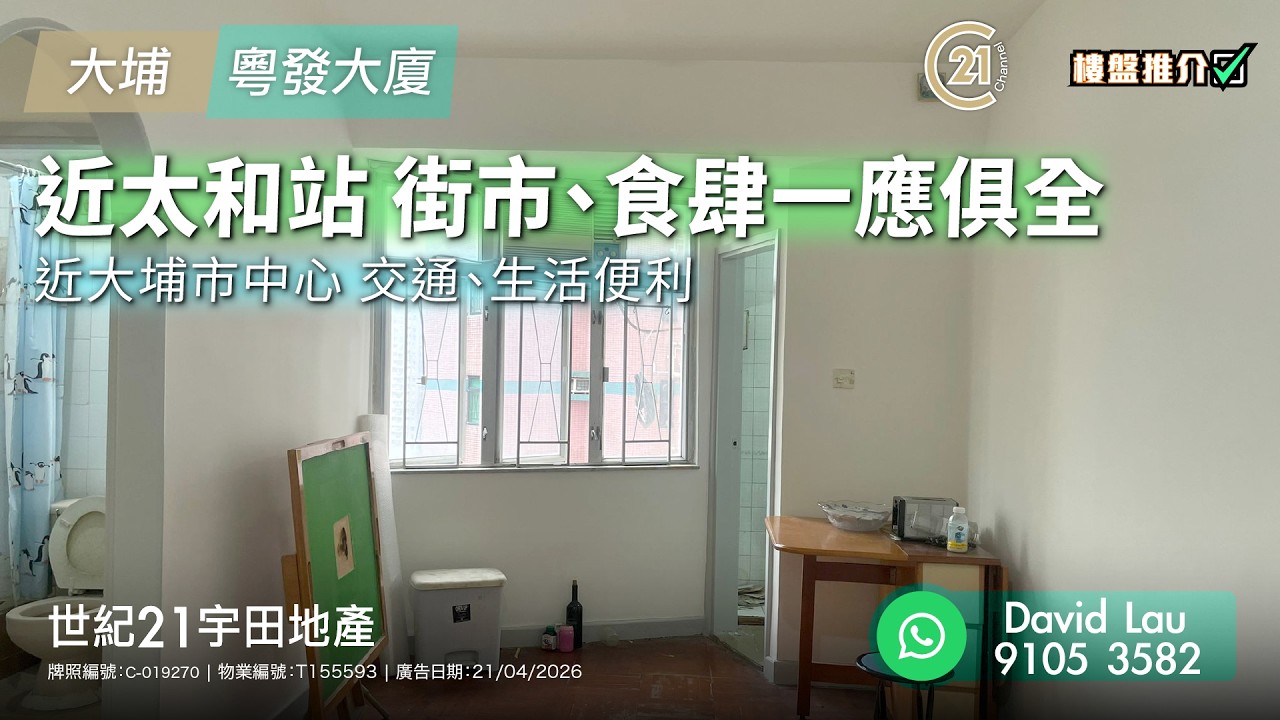 大埔 粵發大廈 (售) 建築面積: 447 呎 電話號碼: 9105 3582 (David Lau) 更多物業資訊:https://url.c21.hk/T155593 世紀21宇田地產 牌照編號: C-019270 物業編號: T155593 廣告日期: 21/04/2026 📲whatsapp查詢:https://url.c21.hk/wts #大埔 #粵發大廈 #2房 #四正實用 #大廳 #交通方便 #太和站 #二手樓盤 #落區睇樓 #一手 #二手 #上車 #租務 #世紀21香港 #世紀21 #C21 #Century21 #21channel #21頻道 ======================================= 世紀21香港官網:https://c21.hk/ 世紀21香港Facebook專頁:https://url.c21.hk/fb 世紀21按揭計算機:https://url.c21.hk/mortgagecaulator --------------------------------------------------- *以上的樓盤資料,由特許經營商提供及擁有,而每辦事處乃獨立擁有及經營(Each CENTURY 21 Office Is Independently Owned and Operated)。由於資料並非實時同步擷取,不確保樓盤廣告能反映樓盤的最新狀態,只僅作參考用途。若有錯漏而引致任何不便及損失,請直接向有關特許經營商或分行查詢,世紀21香港概不負責。 =======================================