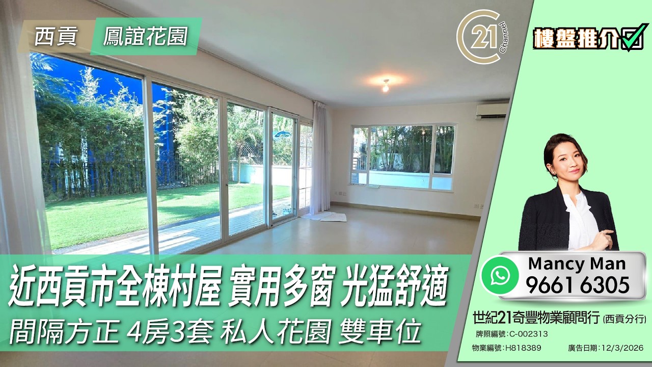 樓盤推介: 近西貢市全棟村屋 實用多窗 光猛舒適 間隔方正 4房3套 私人花園 雙車位 | 西貢 鳳誼花園 | More details 👉🏻 https://url.c21.hk/H818389 西貢 鳳誼花園 實用面積: 2,100 呎 電話號碼: 9661 6305 (Mancy Man) 世紀21奇豐物業顧問行 牌照編號:C-002313 物業編號:H818389 廣告日期:12/03/2026 📲whatsapp查詢:https://url.c21.hk/wts #西貢 #鳳誼花園 #多窗 #花園 #雙車位 #4房 #村屋 #方便 #實用 #二手樓盤 #落區睇樓 #一手 #二手 #上車 #租務 #世紀21香港 #世紀21 #C21 #Century21 #21channel #21頻道 ---------------------------------------------------- 📍設定「搶先看」樓盤資訊即時收看📍 🔎世紀21香港官網 👉 https://c21.hk/ 🖥世紀21香港Facebook👉 https://url.c21.hk/fb 📞聯絡查詢:28697221 🔻讚好🔻訂閱🔻分享🔻LIKE🔻FOLLOW🔻SHARE ---------------------------------------------------- *以上的樓盤資料,由特許經營商提供及擁有,而每辦事處乃獨立擁有及經營(Each CENTURY 21 Office Is Independently Owned and Operated)。由於資料並非實時同步擷取,不確保樓盤廣告能反映樓盤的最新狀態,只僅作參考用途。若有錯漏而引致任何不便及損失,請直接向有關特許經營商或分行查詢,世紀21香港概不負責。