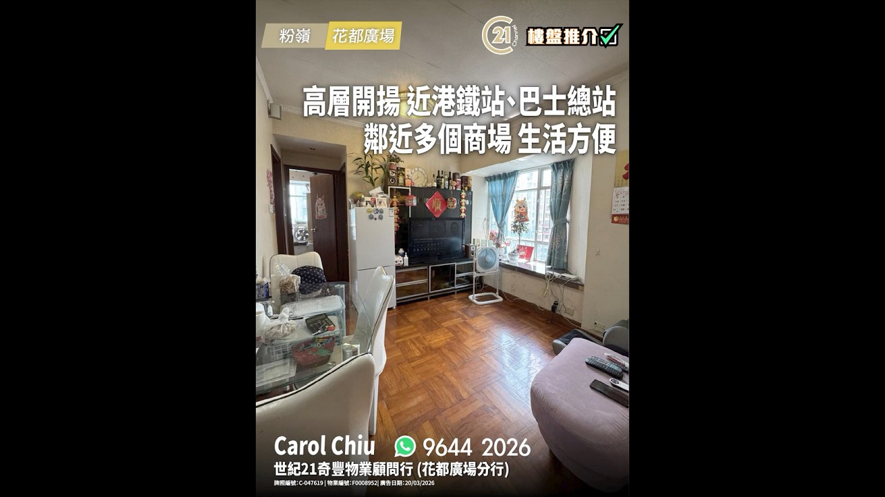 樓盤推介:高層開揚 近港鐵站、巴士總站 鄰近多個商場 生活方便 | 粉嶺 花都廣場 | More Details: https://url.c21.hk/F0008952 粉嶺 花都廣場 實用面積: 370 呎 電話號碼: 9644 2026 (Carol Chiu) 世紀21奇豐物業顧問行 (花都廣場分行) 牌照編號: C-047619 物業編號: F0008952 廣告日期: 20/03/2026 📲whatsapp查詢:https://url.c21.hk/wts #粉嶺 #花都廣場 #2房 #港鐵站 #華明邨 #碧湖花園 #商場 #二手樓盤 #落區睇樓 #一手 #二手 #上車 #租務 #世紀21香港 #世紀21 #C21 #Century21 #21channel #21頻道 ---------------------------------------------------- 📍設定「搶先看」樓盤資訊即時收看📍 🔎世紀21香港官網 👉 https://c21.hk/ 🖥世紀21香港Facebook👉 https://url.c21.hk/fb 📞聯絡查詢:28697221 🔻讚好🔻訂閱🔻分享🔻LIKE🔻FOLLOW🔻SHARE ---------------------------------------------------- *以上的樓盤資料,由特許經營商提供及擁有,而每辦事處乃獨立擁有及經營(Each CENTURY 21 Office Is Independently Owned and Operated)。由於資料並非實時同步擷取,不確保樓盤廣告能反映樓盤的最新狀態,只僅作參考用途。若有錯漏而引致任何不便及損失,請直接向有關特許經營商或分行查詢,世紀21香港概不負責。