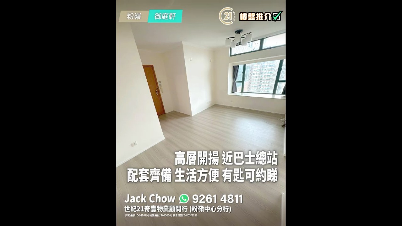 樓盤推介:高層開揚 近巴士總站 配套齊備 生活方便 有匙可約睇 | 粉嶺 御庭軒 | More Details: https://url.c21.hk/F045020 粉嶺 御庭軒 實用面積: 462 呎 電話號碼: 9261 4811 (Jack Chow) 世紀21奇豐物業顧問行 (粉嶺中心分行) 牌照編號: C-047619 物業編號: F045020 廣告日期: 20/03/2026 📲whatsapp查詢:https://url.c21.hk/wts #粉嶺 #御庭軒 #2房 #聯和墟 #逸峯 #oneinnovale #粉嶺北新發展區 #碧湖花園 #商場 #二手樓盤 #落區睇樓 #一手 #二手 #上車 #租務 #世紀21香港 #世紀21 #C21 #Century21 #21channel #21頻道 ---------------------------------------------------- 📍設定「搶先看」樓盤資訊即時收看📍 🔎世紀21香港官網 👉 https://c21.hk/ 🖥世紀21香港Facebook👉 https://url.c21.hk/fb 📞聯絡查詢:28697221 🔻讚好🔻訂閱🔻分享🔻LIKE🔻FOLLOW🔻SHARE ---------------------------------------------------- *以上的樓盤資料,由特許經營商提供及擁有,而每辦事處乃獨立擁有及經營(Each CENTURY 21 Office Is Independently Owned and Operated)。由於資料並非實時同步擷取,不確保樓盤廣告能反映樓盤的最新狀態,只僅作參考用途。若有錯漏而引致任何不便及損失,請直接向有關特許經營商或分行查詢,世紀21香港概不負責。