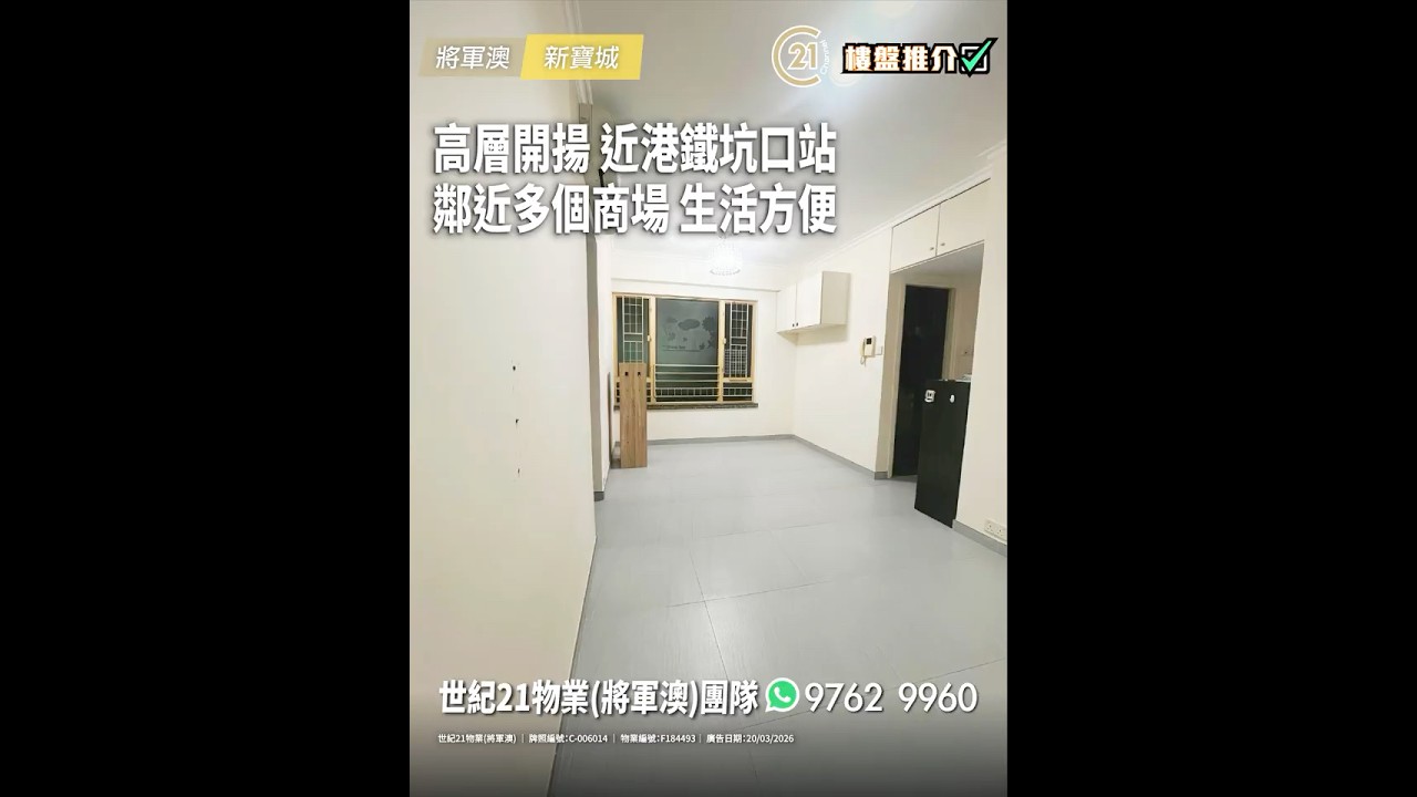 樓盤推介:高層開揚 近港鐵坑口站 鄰近多個商場 生活方便 | 將軍澳 新寶城 | More Details: https://url.c21.hk/F184493 將軍澳 新寶城 第01座 (租) 實用面積: 436 呎 電話號碼: 9762 9960 - 世紀21物業(將軍澳)團隊 世紀21物業(將軍澳) 牌照編號: C-006014 物業編號: F184493 廣告日期: 20/03/2026 📲whatsapp查詢:https://url.c21.hk/wts #將軍澳 #新寶城 #港鐵 #坑口站 #高層 #2房 #東港城 #南豐廣場 #TKOgateway #交通方便 #二手樓盤 #落區睇樓 #一手 #二手 #上車 #租務 #世紀21香港 #世紀21 #C21 #Century21 #21channel #21頻道 ---------------------------------------------------- 📍設定「搶先看」樓盤資訊即時收看📍 🔎世紀21香港官網 👉 https://c21.hk/ 🖥世紀21香港Facebook👉 https://url.c21.hk/fb 📞聯絡查詢:28697221 🔻讚好🔻訂閱🔻分享🔻LIKE🔻FOLLOW🔻SHARE ---------------------------------------------------- *以上的樓盤資料,由特許經營商提供及擁有,而每辦事處乃獨立擁有及經營(Each CENTURY 21 Office Is Independently Owned and Operated)。由於資料並非實時同步擷取,不確保樓盤廣告能反映樓盤的最新狀態,只僅作參考用途。若有錯漏而引致任何不便及損失,請直接向有關特許經營商或分行查詢,世紀21香港概不負責。
