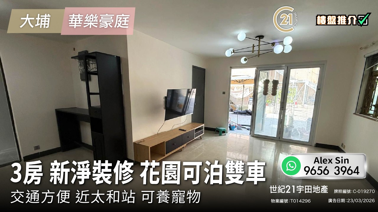 樓盤推介:3房 新淨裝修 花園可泊雙車交通方便 近太和站 可養寵物 | 大埔 華樂豪庭 | More Details: https://url.c21.hk/T014296 大埔 華樂豪庭 (租) 建築面積: 700 呎 電話號碼: 9656 3964 (Alex Sin) 世紀21宇田地產 牌照編號: :C-019270 物業編號: T014296 廣告日期: 23/03/2026 📲whatsapp查詢:https://url.c21.hk/wts #大埔 #華樂豪庭 #地下 #3房 #寵物 #交通方便 #村屋 #二手樓盤 #落區睇樓 #一手 #二手 #上車 #租務 #世紀21香港 #世紀21 #C21 #Century21 #21channel #21頻道 ---------------------------------------------------- 📍設定「搶先看」樓盤資訊即時收看📍 🔎世紀21香港官網 👉 https://c21.hk/ 🖥世紀21香港Facebook👉 https://url.c21.hk/fb 📞聯絡查詢:28697221 🔻讚好🔻訂閱🔻分享🔻LIKE🔻FOLLOW🔻SHARE ---------------------------------------------------- *以上的樓盤資料,由特許經營商提供及擁有,而每辦事處乃獨立擁有及經營(Each CENTURY 21 Office Is Independently Owned and Operated)。由於資料並非實時同步擷取,不確保樓盤廣告能反映樓盤的最新狀態,只僅作參考用途。若有錯漏而引致任何不便及損失,請直接向有關特許經營商或分行查詢,世紀21香港概不負責。