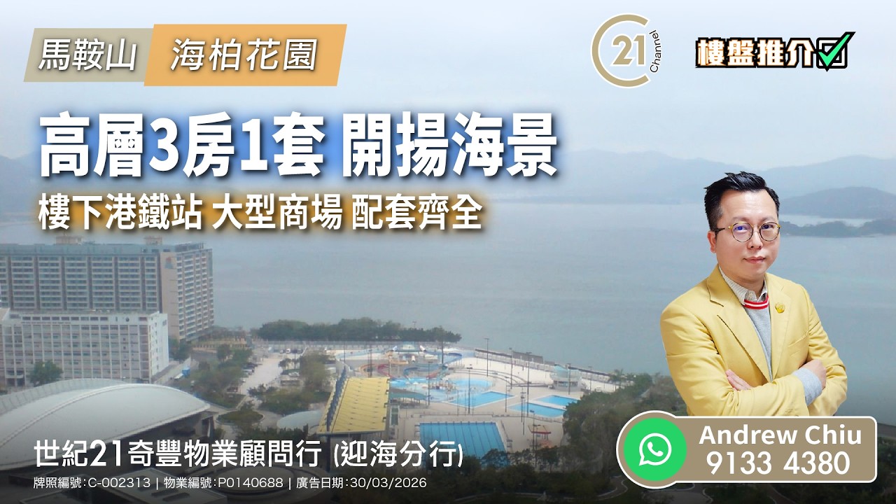 樓盤推介:高層3房1套 開揚海景 樓下港鐵站 大型商場 配套齊全 | 馬鞍山 海柏花園 | More details: https://url.c21.hk/P0140688 馬鞍山 海柏花園 (售) 實用面積: 560 呎 電話號碼: 9133 4380 (Andrew Chiu) 世紀21奇豐物業顧問行(迎海分行) 牌照編號: C-002313 物業編號: P0140688 廣告日期: 30/03/2026 📲whatsapp查詢:https://url.c21.hk/wts #馬鞍山 #海柏花園 #海景 #港鐵站 #開揚 #馬鞍山站 #馬鞍山廣場 #馬鞍山公園 #新港城 #海典居 #3房 #方便 #二手樓盤 #落區睇樓 #一手 #二手 #上車 #租務 #世紀21香港 #世紀21 #C21 #Century21 #21channel #21頻道 ---------------------------------------------------- 📍設定「搶先看」樓盤資訊即時收看📍 🔎世紀21香港官網 👉 https://c21.hk/ 🖥世紀21香港Facebook👉 https://url.c21.hk/fb 📞聯絡查詢:28697221 🔻讚好🔻訂閱🔻分享🔻LIKE🔻FOLLOW🔻SHARE ---------------------------------------------------- *以上的樓盤資料,由特許經營商提供及擁有,而每辦事處乃獨立擁有及經營(Each CENTURY 21 Office Is Independently Owned and Operated)。由於資料並非實時同步擷取,不確保樓盤廣告能反映樓盤的最新狀態,只僅作參考用途。若有錯漏而引致任何不便及損失,請直接向有關特許經營商或分行查詢,世紀21香港概不負責。