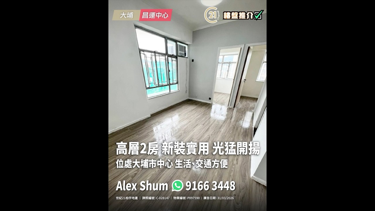 樓盤推介: 高層2房 新裝實用 光猛開揚 位處大埔市中心 生活、交通方便 | 大埔 昌運中心 | More Details: https://url.c21.hk/P097590 大埔 昌運中心 (售) 實用面積: 339 呎 電話號碼: 9166 3448 (Alex Shum) 世紀21柏宇地產 牌照編號:C-028147 物業編號:P097590 廣告日期:31/03/2026 📲whatsapp查詢:https://url.c21.hk/wts #大埔 #昌運中心 #2房 #新裝修 #高層 #光猛 #交通方便 #二手樓盤 #落區睇樓 #一手 #二手 #上車 #租務 #世紀21香港 #世紀21 #C21 #Century21 #21channel #21頻道 ---------------------------------------------------- 📍設定「搶先看」樓盤資訊即時收看📍 🔎世紀21香港官網 👉 https://c21.hk/ 🖥世紀21香港Facebook👉 https://url.c21.hk/fb 📞聯絡查詢:28697221 🔻讚好🔻訂閱🔻分享🔻LIKE🔻FOLLOW🔻SHARE ---------------------------------------------------- *以上的樓盤資料,由特許經營商提供及擁有,而每辦事處乃獨立擁有及經營(Each CENTURY 21 Office Is Independently Owned and Operated)。由於資料並非實時同步擷取,不確保樓盤廣告能反映樓盤的最新狀態,只僅作參考用途。若有錯漏而引致任何不便及損失,請直接向有關特許經營商或分行查詢,世紀21香港概不負責。