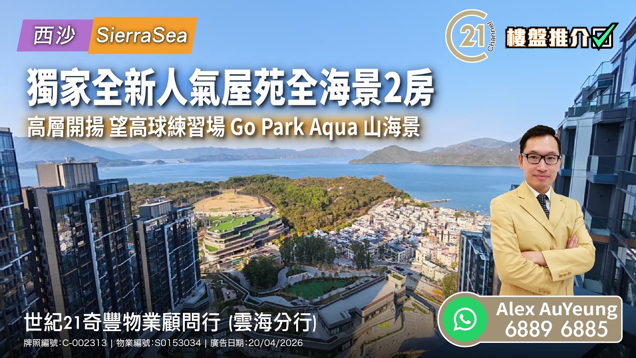 西沙 Sierra Sea (租/售) 實用面積: 381 呎 電話號碼: 6889 6885 (Alex AuYeung) 更多物業資訊:https://url.c21.hk/S0153034 世紀21奇豐物業顧問行 (天宇海分行) 牌照編號: C-002313 物業編號: S0153034 廣告日期: 20/04/2026 📲whatsapp查詢:https://url.c21.hk/wts #西沙 #Sierrasea #山海景 #開揚 #高層 #2房 #GoPark #交通方便 #二手樓盤 #落區睇樓 #一手 #二手 #上車 #租務 #世紀21香港 #世紀21 #C21 #Century21 #21channel #21頻道 ======================================= 世紀21香港官網:https://c21.hk/ 世紀21香港Facebook專頁:https://url.c21.hk/fb 世紀21按揭計算機:https://url.c21.hk/mortgagecaulator --------------------------------------------------- *以上的樓盤資料,由特許經營商提供及擁有,而每辦事處乃獨立擁有及經營(Each CENTURY 21 Office Is Independently Owned and Operated)。由於資料並非實時同步擷取,不確保樓盤廣告能反映樓盤的最新狀態,只僅作參考用途。若有錯漏而引致任何不便及損失,請直接向有關特許經營商或分行查詢,世紀21香港概不負責。 =======================================