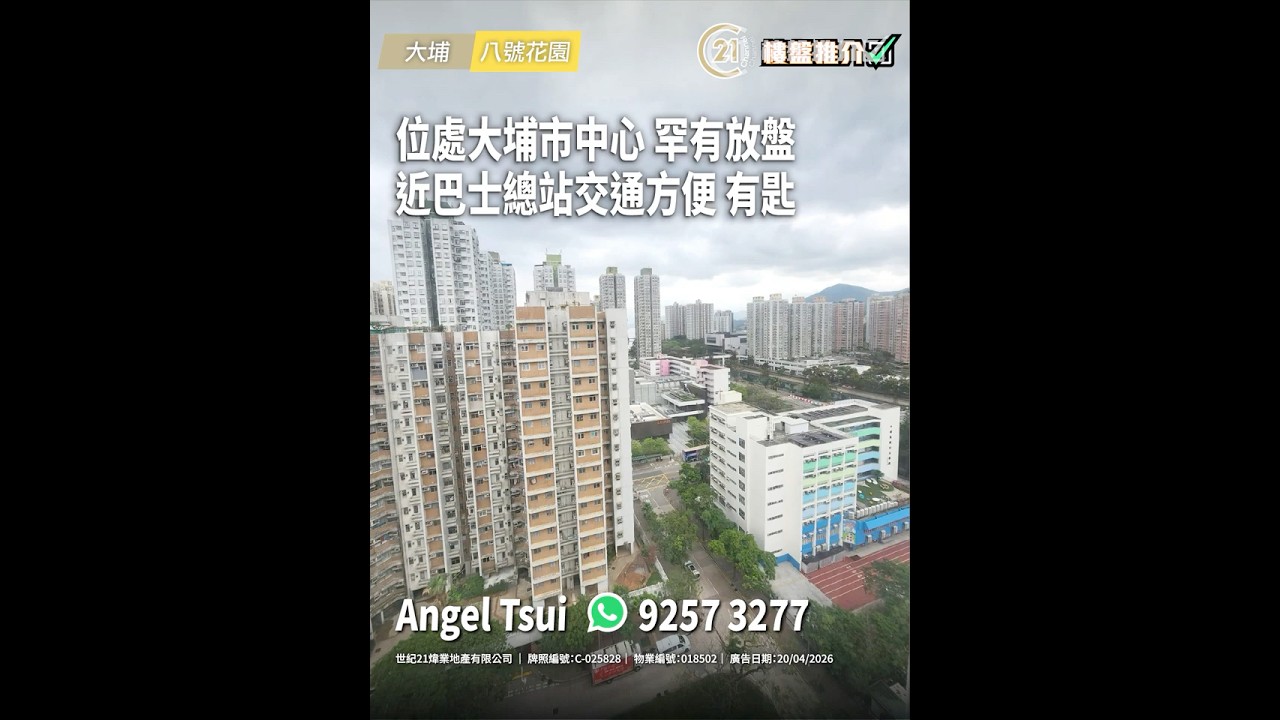 大埔 八號花園 (售/租) 實用面積: 438 呎 平台面積: 528 呎 電話號碼: 9257 3277 (Angel Tsui) 更多物業資訊:https://url.c21.hk/018502 世紀21煒業地產 牌照編號:C-025828 物業編號:018502 廣告日期:20/04/2026 📲whatsapp查詢:https://url.c21.hk/wts #大埔 #八號花園 #頂層 #2房 #平台 #開揚 #河景 #光猛 #交通方便 #二手樓盤 #落區睇樓 #一手 #二手 #上車 #租務 #世紀21香港 #世紀21 #C21 #Century21 #21channel #21頻道 ======================================= 世紀21香港官網:https://c21.hk/ 世紀21香港Facebook專頁:https://url.c21.hk/fb 世紀21按揭計算機:https://url.c21.hk/mortgagecaulator --------------------------------------------------- *以上的樓盤資料,由特許經營商提供及擁有,而每辦事處乃獨立擁有及經營(Each CENTURY 21 Office Is Independently Owned and Operated)。由於資料並非實時同步擷取,不確保樓盤廣告能反映樓盤的最新狀態,只僅作參考用途。若有錯漏而引致任何不便及損失,請直接向有關特許經營商或分行查詢,世紀21香港概不負責。 =======================================